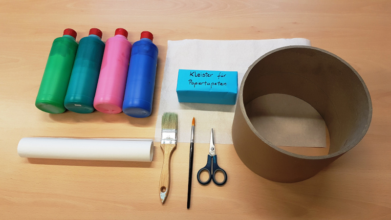 Bestreiche jedes Papierstück mit Kleister und klebe es nacheinander auf die Trommelöffnung.